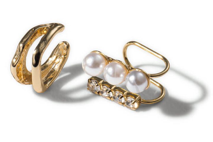 華やかなパールイヤカフと、シンプルなゴールドイヤカフのセット。片耳にまとめづけしたり、両耳に分けてつけたりとアレンジは自由自在。
