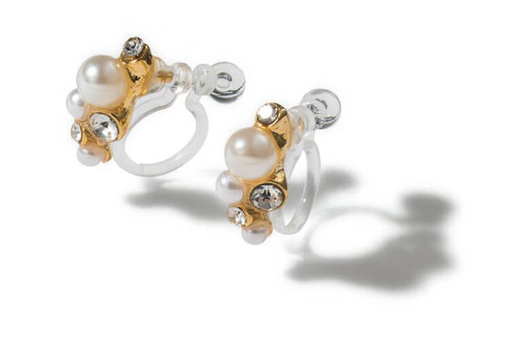 大小さまざまなパール&ビジューを組み合わせ。留め具部分が樹脂になっているので金属アレルギーの方でも安心です。