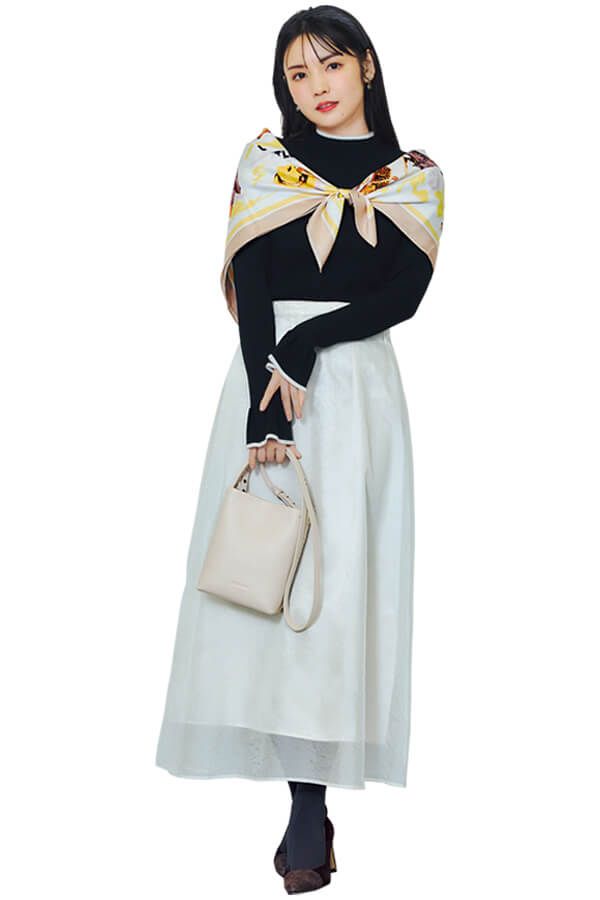 スカーフ¥8,910/アンタイトル ニット¥20,900/TIARA スカート¥17,930/アンクレイヴ スタンダード(オンワード樫山 お客様相談室) カチューシャ¥8,250/IRIS47 イヤリング¥15,400/ランバン オン ブルー(ヴァンドームヤマダ) バッグ¥20,900/アドカラム(アンソロジー) タイツ¥880/アツギ ザ レッグ バー(アツギ) 靴¥22,000/モード•エ•ジャコモ(オギツ)