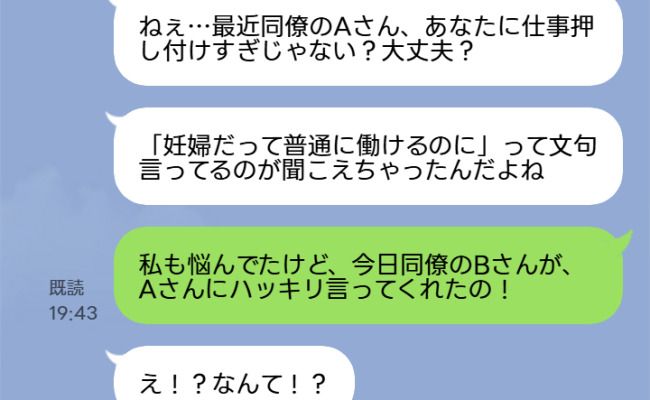 私は看護師として働いています。第1子の妊娠を職場に報告すると、体調面を考慮して夜勤を免除してもらえることに。それから日勤中、Aさんが私にばかり仕事を振ってくるようになったのです……。ある日、同僚男性がAさんに――!?