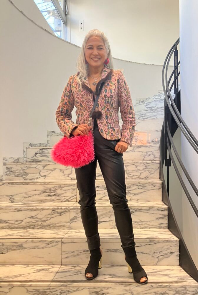 3. 【60代お手本スナップ】ビンテージのレザーパンツを女性らしく着こなすには? ピンクアイテムでやわらかさをプラス!