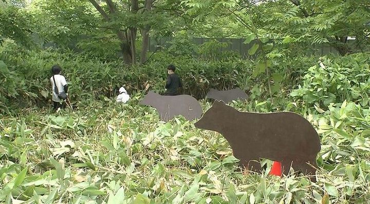 札幌のクマ対策の草刈りで、等身大パネルを置いて効果を視覚化する実証実験を行った。見通しがよくなるとクマの侵入を防ぎ、ばったり出会うリスクも減らせる。白いTシャツの後ろ姿が筆者