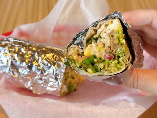 ロメインレタス/ケール/キャベツ/ビーンズ/オニオン&ピーマン/チーズ/グリーンソース/サワークリーム/トマトサルサ/コーンサルサ/玄米