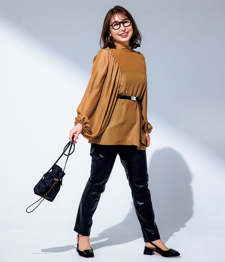 ベルト[115㎝]¥11,000(レフィエ/フラッパーズ)ブラウス¥20,900(ティアラ)パンツ¥24,200(カデュネ/カデュネ プレスルーム)バッグ¥10,780(ノマディス/ノーベルバ)パンプス¥44,000(ダブルスタンダードクロージング/フィルム)メガネ¥42,900(アイヴァン/アイヴァン 東京ギャラリー)ピアス¥44,660(ソコ/ZUTTOHOLIC)