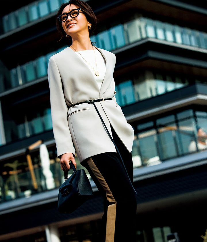 ニュアンス色の優しげジャケットを、極細ベルトで引き締めて堂々と。