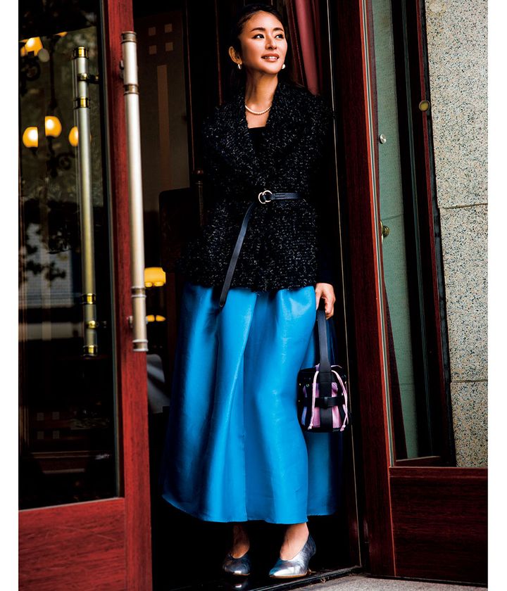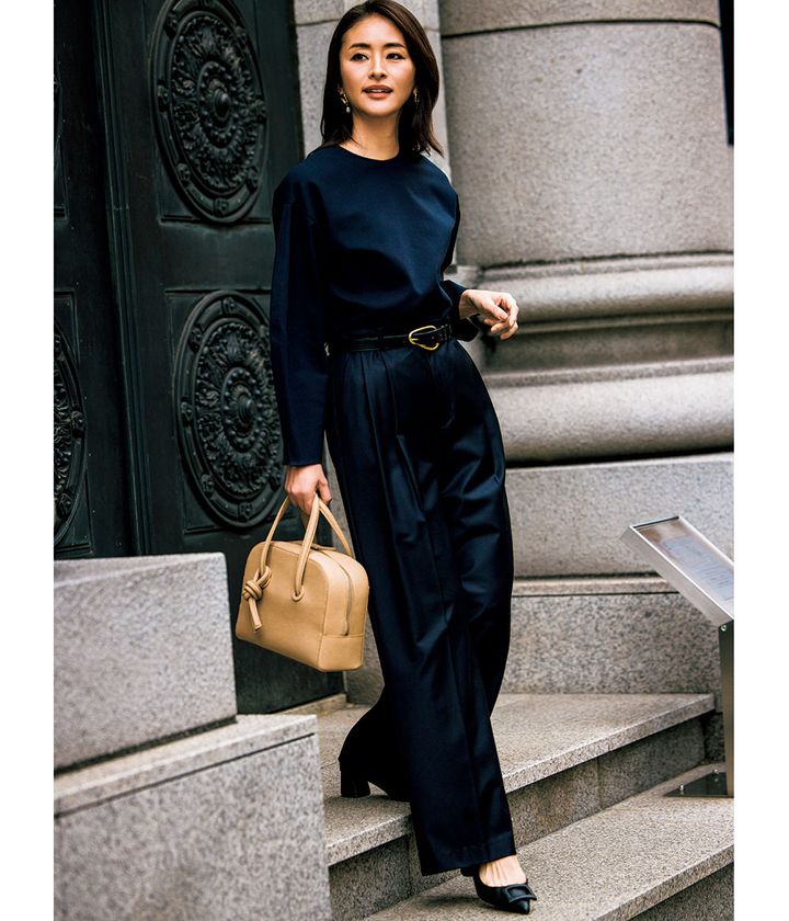 ベルト[96㎝]¥26,400バッグ¥69,300(ともにア ヴァケーション/ノーベルバ)ジャケット¥24,200(ジャスグリッティー/ジャスグリッティー プレスルーム)ニット¥13,200(ルーニィ)パンツ¥16,000(バナナ・リパブリック)パンプス¥12,650(アルテミス by ダイアナ/アルテミス by ダイアナ アーバンドック ららぽーと豊洲店)バングル¥19,250〈ともにチビ・ジュエルズ〉ネックレス¥22,000〈ジゼルベー〉リング¥12,320〈バルブス〉(すべてZUTTOHOLIC)