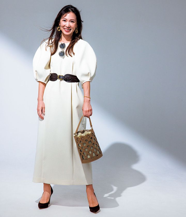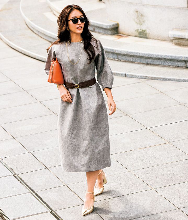 ベルト[97㎝]¥6,990(MANGO)ワンピース¥39,600(カデュネ/カデュネ プレスルーム)バッグ¥13,200(アルテミス by ダイアナ/アルテミス by ダイアナ アーバンドックららぽーと豊洲店)パンプス¥17,600(ダイアナ/ダイアナ 銀座本店)サングラス¥50,600(アイヴァン/アイヴァン 東京ギャラリー)ピアス¥24,400〈ジゼルベー〉ブレスレット¥23,540〈エムシー・スタジオ〉(ともにZUTTOHOLIC)