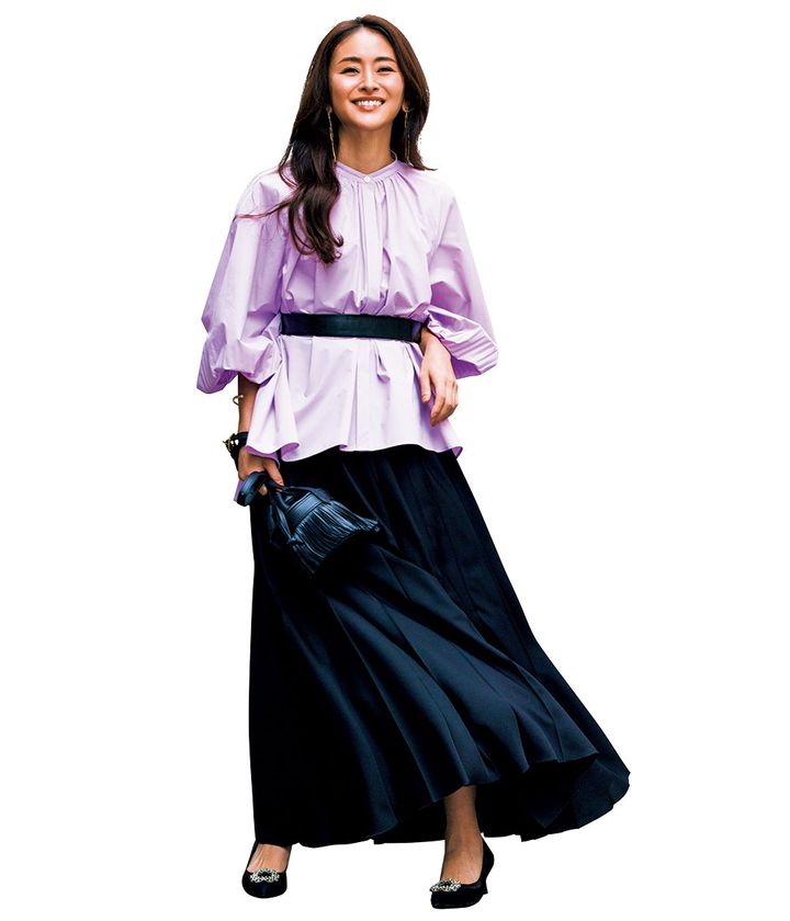 ゆったりブラウスを細長ベルトで締めて、腰高なスタイルを演出!