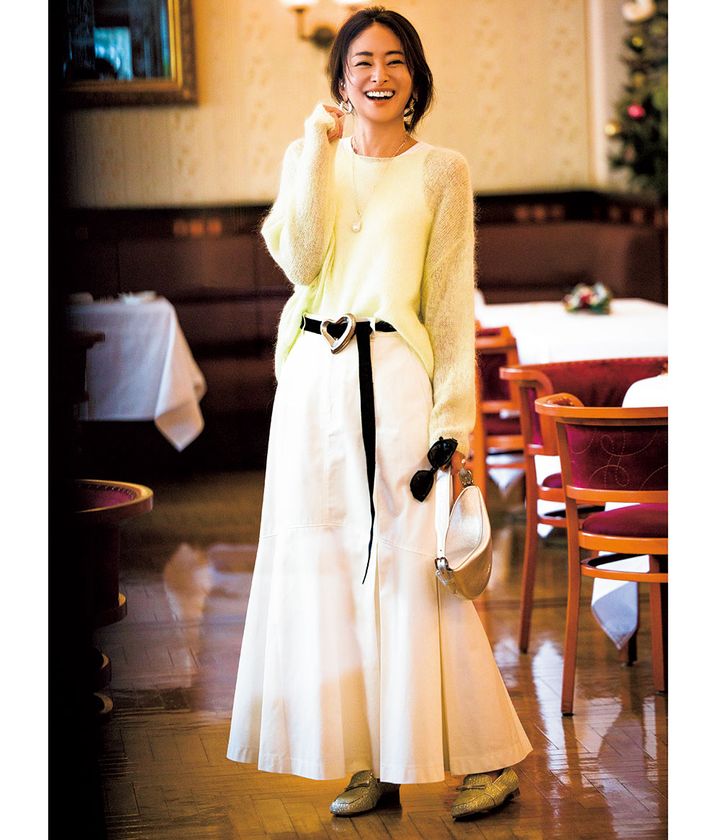 ベルト[160㎝]¥25,300(SEA/エスストア)ニット¥16,500(emmi/emmi ニューマン新宿店)タンクトップ¥5,940(Mila Owen/Mila Owen ルミネ新宿2店)スカート¥39,600(ADORE/ADORE 六本木ヒルズ店)バッグ¥103,400(J&M デヴィッドソン/J&M デヴィッドソン カスタマーセンター)シューズ¥71,500(ネブローニ)サングラス¥27,500(ブリース/フラッパーズ)ピアス¥33,400(バルブス/ZUTTOHOLIC)ネックレス¥49,500(リューク)
