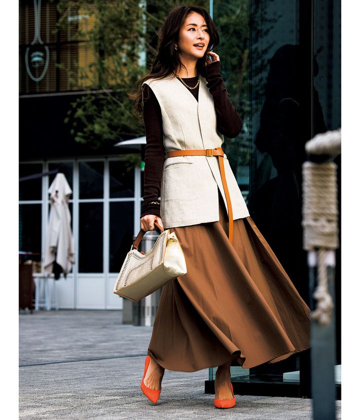 ベルト[131㎝]¥13,200(レフィエ/フラッパーズ)ジレ¥44,000(ドローイング ナンバーズ/ドローイング ナンバーズ 新宿店)ニット¥15,400(カデュネ/カデュネ プレスルーム)ブラウンスカート¥36,300(ソブ/フィルム)バッグ¥86,900(ジャンニ キアリーニ/ジャンニ キアリーニ 銀座店)パンプス¥64,900(ネブローニ)ピアス¥20,900ネックレス¥46,200リング¥20,900ブレスレット¥34,100(すべてローラ ロンバルディ/八木通商)
