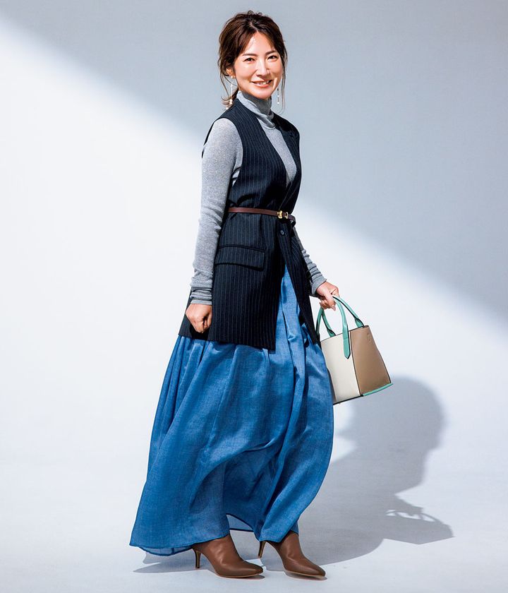 シンプル細長ベルトで定番ジレコーデの鮮度UP