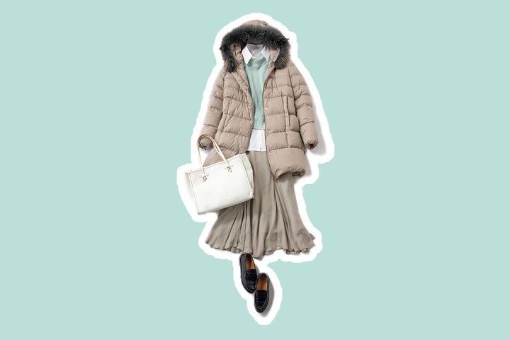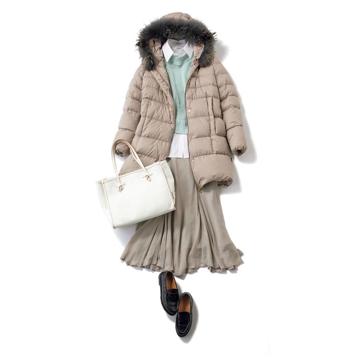 春待ちダウンコーデは ベージュまとめなら重たく見えない!
