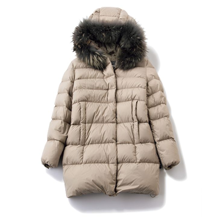 本格ダウンコートも軽いベージュを選べば、真冬はもちろん、春先まで着こなしやすいんです。¥209,000(デュベティカ/F.E.N.)