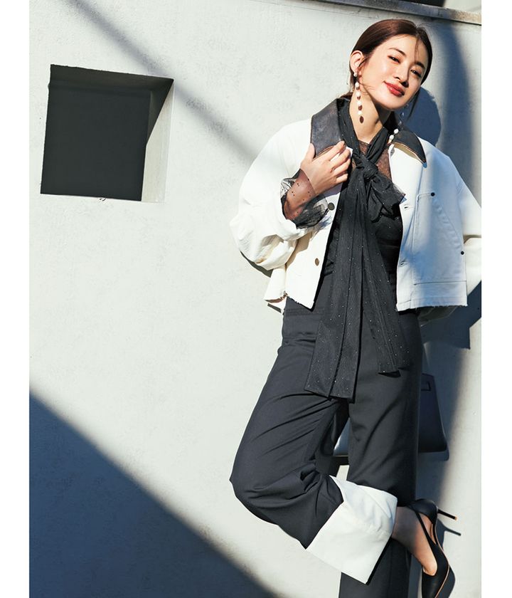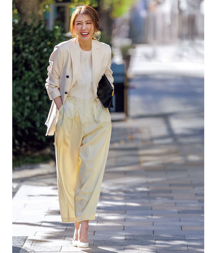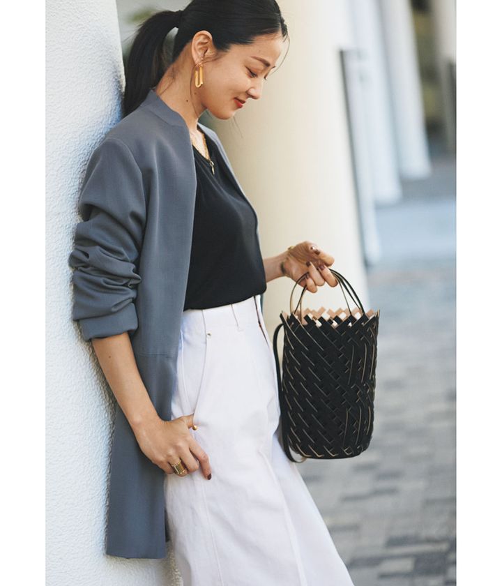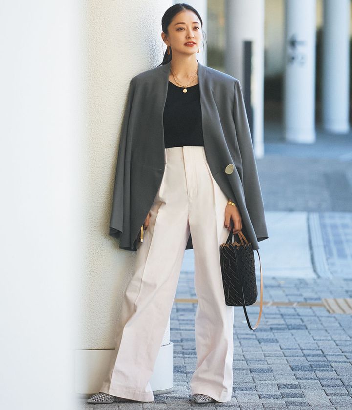 ジャケット¥30,800(カデュネ)トップス¥22,000(オペラスポーツ/サードマガジン)パンツ¥28,600(プランクプロジェクト/プランクプロジェクト 青山店)バッグ¥40,700(コムサ/ファイブフォックス カスマターサービス)パンプス¥51,700(カチム)ピアス¥13,200(ダブルスタンダードクロージング/フィルム)