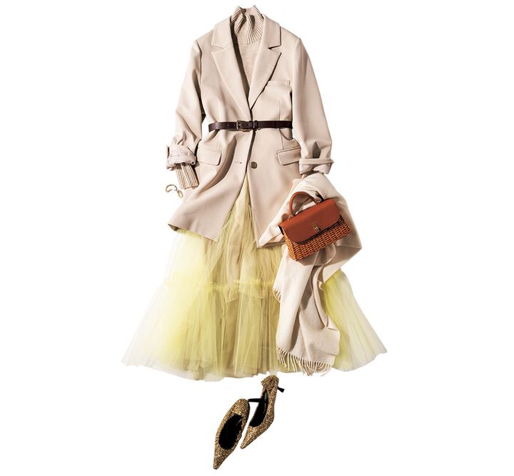 甘くキュートな印象のイエローチュールにはロングJKで知的に。黄色に馴染むベージュ合わせで大人ムードに。