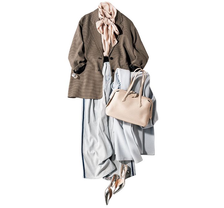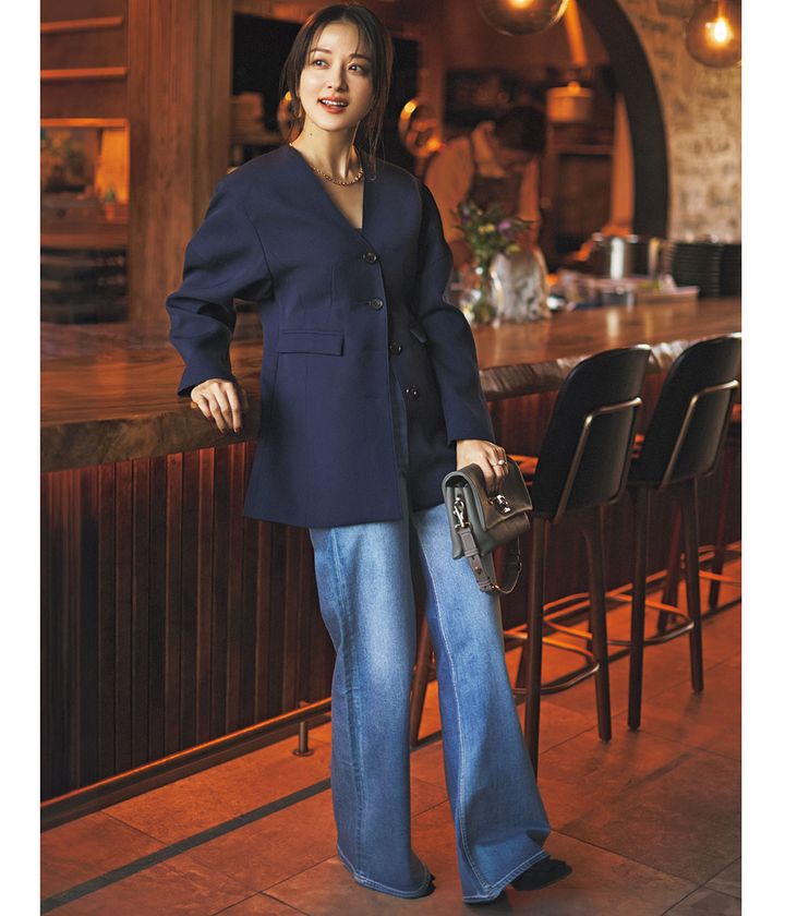 ジャケット¥14,960(ノミネ/アバハウスインターナショナル オンラインストア)ブラウス¥25,300(ウィム ガゼット/ウィム ガゼット 玉川髙島屋S・C店)デニムパンツ¥22,000(アダム エ ロペ)コート¥57,200(アルページュストーリーオリジナル)バッグ¥62,700(ヴァジック/ヴァジックジャパン)パンプス¥62,700(ネブローニ)バングル¥80,520(バルブス/ZUTTOHOLIC)