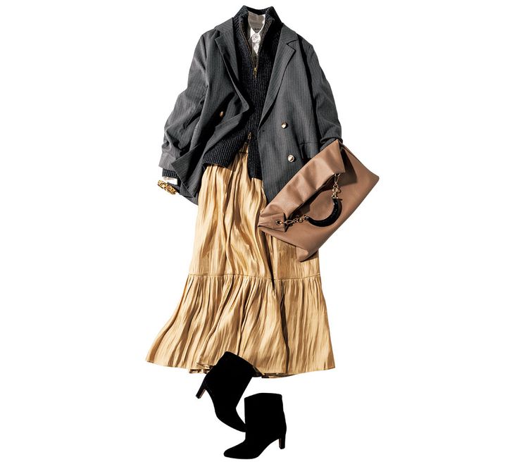 スカート¥31,900(styling//styling/ ルミネ新宿1店)ダブルジャケット¥42,900(フラデリ)ブルゾン¥93,500(マディソンブルー)スウェット¥19,800〈プロタゴニスタ〉バッグ¥35,200〈モフィオラ〉(ともにアマン)ブーツ¥47,300(ピッピシック/ベイジュ)ピアス¥13,200(ダブルスタンダードクロージング/フィルム)