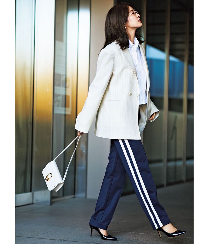 ラインパンツでスタイリッシュに盛る! 端正なジャケット合わせで海外のファッショニスタ風スポーティリッチな着こなしを。シュッと美脚効果も期待大。