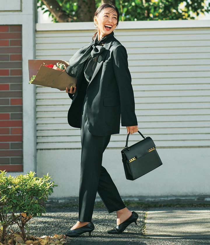 ブラウス¥42,900(エポカ/SANYO SHOKAI カスタマーサポート)ジャケット¥24,200(カデュネ/カデュネ プレスルーム)パンツ¥53,900(エイトン/エイトン青山)バッグ¥22,000(銀座かねまつ/銀座かねまつ6丁目本店)靴¥17,600(ダイアナ/ダイアナ 銀座本店)ピアス¥62,700(ヌゥ ユゥ/アイネックス)