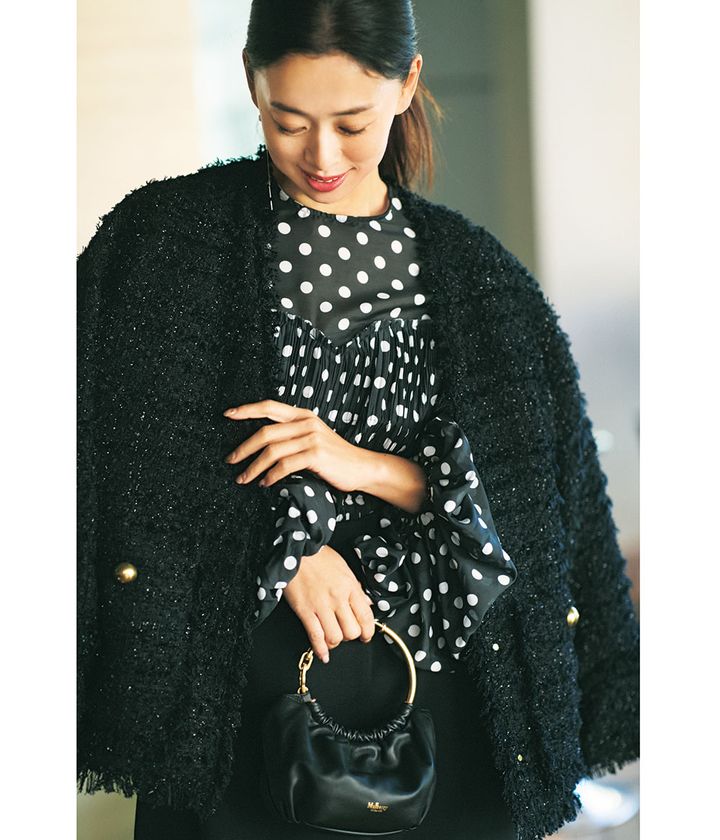 顔まわりの旬な華やぎでオシャレな印象を独り占め! 主張のあるドットブラウスには、スッキリ見せるノーカラージャケットが好相性。上品ながらも存在感のある佇まいは、謝恩会でも視線を集めそう。旬な素材と柄合わせがシャレ感たっぷり。