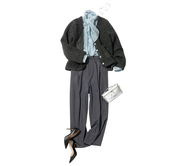ブラウス¥75,900(コート/イザ)ジャケット¥37,400(プランクプロジェクト/プランクプロジェクト 青山店)パンツ¥22,000(エンフォルド)バッグ¥104,500(メゾンヴァジック/ヴァジックジャパン)パンプス¥137,500(ジャンヴィト ロッシ/ジャンヴィト ロッシ ジャパン)ピアス¥52,800(MAAYA)