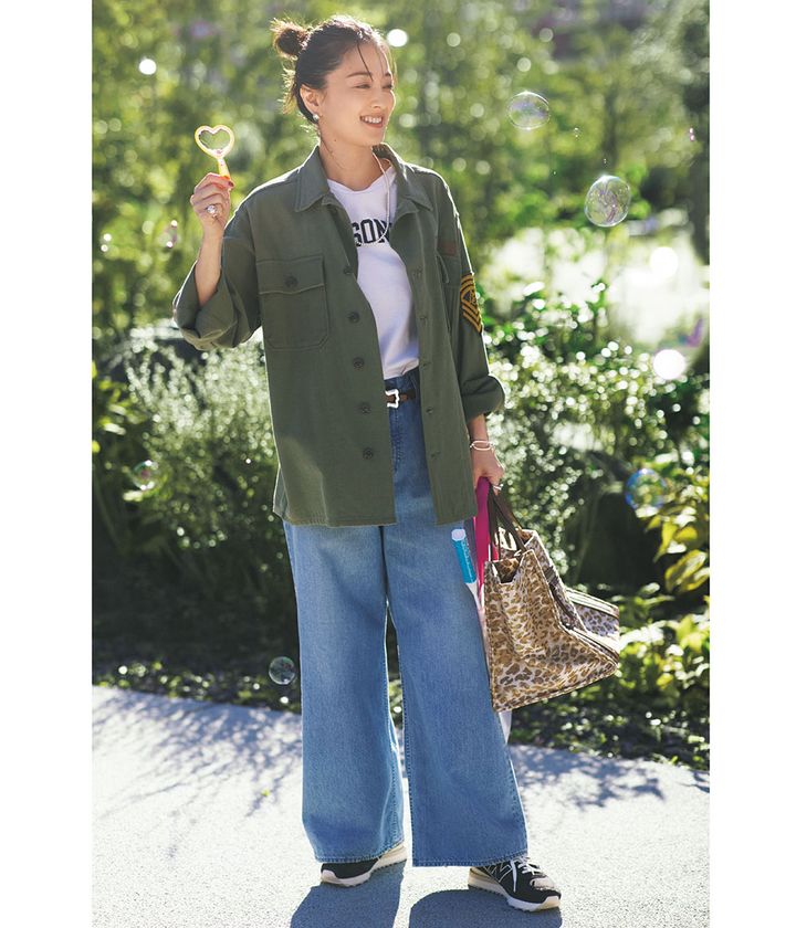 公園スタイルはやんちゃな羽織りでエッジを利かせて脱・ご近所着に。下位置ポケットで美ヒップライン。