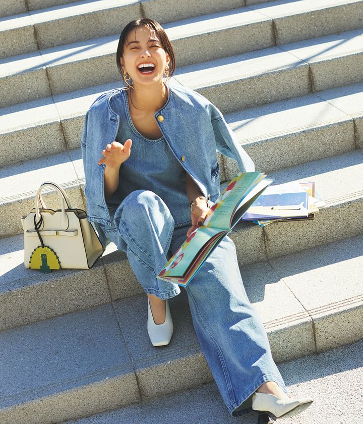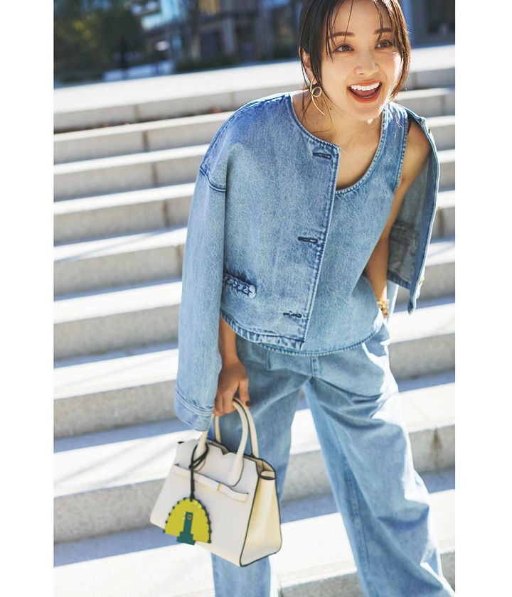 デニムパンツ¥42,900(デンハム/デンハム・ジャパン)ジャケット¥82,500(アキラナカ/ハルミ ショールーム)バッグ¥355,300(トッズ/トッズ・ジャパン)パンプス¥31,900(ツル バイ マリコ オイカワ)ピアス¥3,850リング[左手薬指]¥3,080(ともにヘンカ/ロードス)ネックレス¥68,200(ブランイリス/ブランイリス トーキョー)リング[左手中指]¥51,700(アナプノエ/フォーティーン ショールーム)タンクトップ(スタイリスト私物)