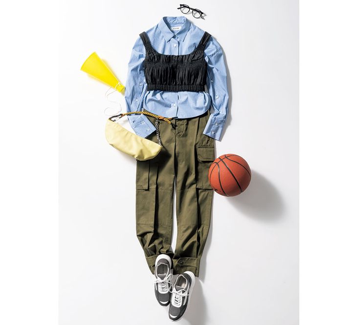 ビスチェ¥22,000(イコールメント)シャツ¥49,500(サクラ/インターリブ)パンツ¥39,600(タンジェント/ザ エディット ストア)バッグ¥25,300(ノマディス/ノーベルバ)スニーカー¥25,300(ルーニィ)眼鏡¥7,480(Stola.)
