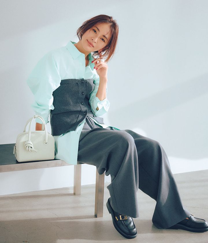 ビスチェ¥4,990(アンフィーロ/オンワード樫山)シャツ¥42,900(サクラ/インターリブ)パンツ¥30,800(エンフォルド)バッグ¥48,400(ヴァジック/ヴァジックジャパン)ローファー¥18,900(CHARLES & KEITH/CHARLES & KEITH JAPAN)ピアス¥19,800(ウノアエレシルバーコレクション/ウノアエレ)ネックレス¥74,800(ブランイリス/ブランイリス トーキョー)リング¥44,000(バルブス/ズットホリック)