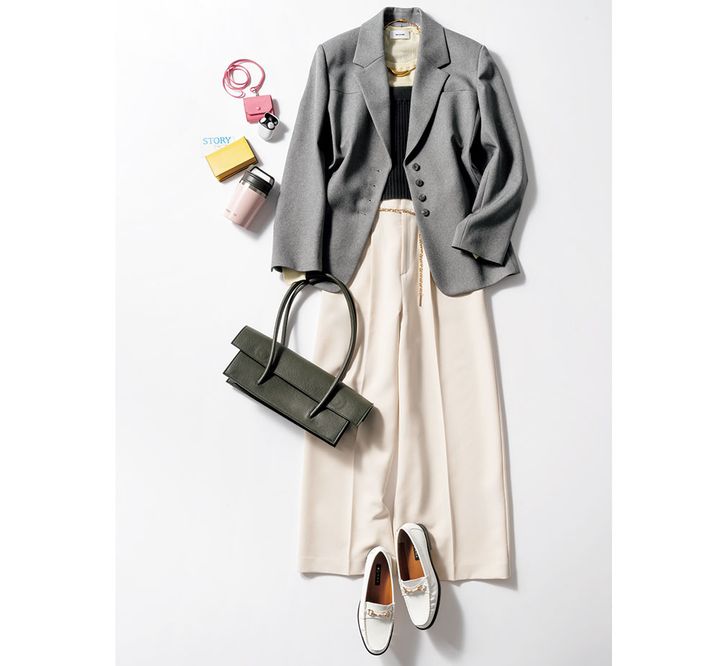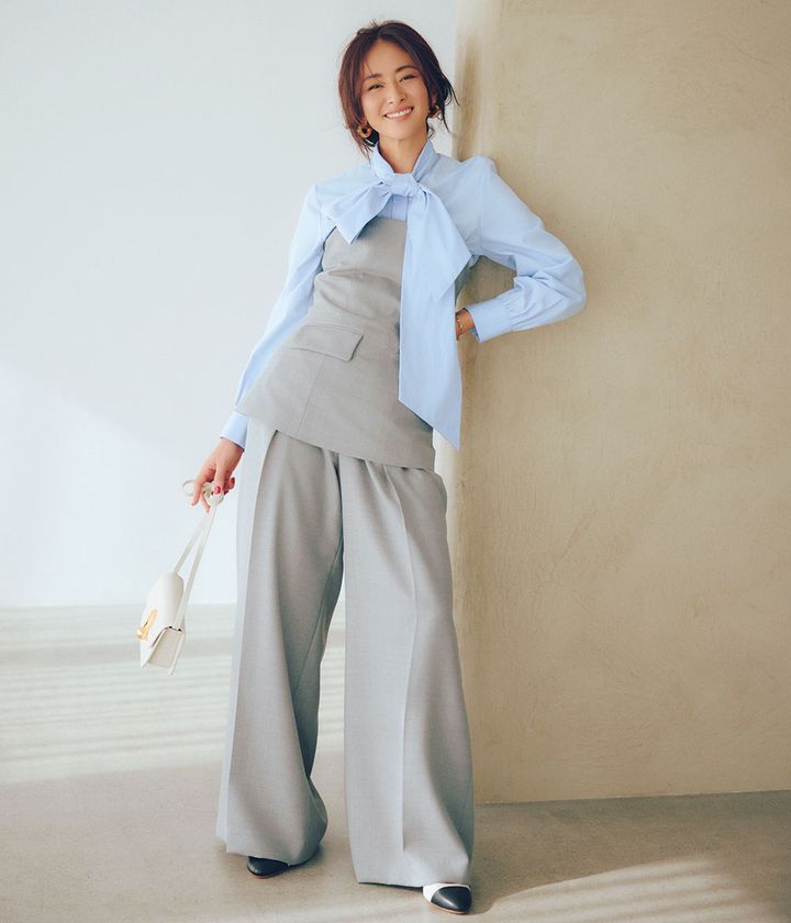 トレンド感ある配色。引き続き豊作なグレーは、思い切ってセットアップで知的見え。対照的なビッグリボンに、愛らしさを託して。
