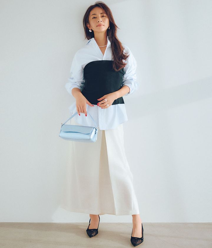 トップスINしづらい、タイトスカート合わせを難なくまとめる助っ人。柔らかいスカイブルーのシャツは黒ビスチェでコーデを引き締め!