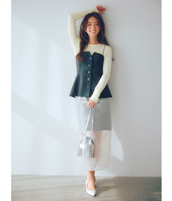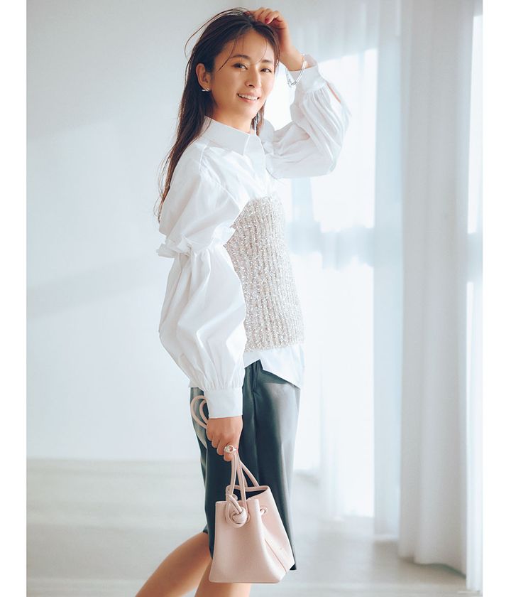 ビスチェ[ニット付き]¥20,900(ELENDEEK)シャツ¥27,500(ルルヴェ/アンタイトル)スカート¥30,800(セテンス)バッグ¥146,300(J&M デヴィッドソン/J&M デヴィッドソン カスタマーセンター)パンプス¥51,150(ファビオ ルスコーニ/エリオポール代官山)ピアス¥3,960(ヘンカ/ロードス)ネックレス¥22,000〈ジゼルベー〉リング[薬指]¥17,380〈バルブス〉リング[人さし指]¥10,340〈フル・オブ・グレイス〉(すべてズットホリック)