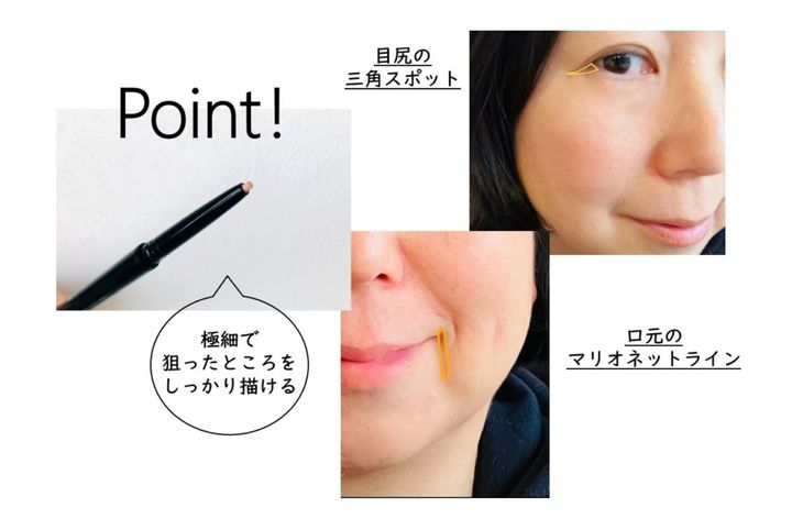 年を重ねることで優しい顔になった気がするのは、加齢で目尻が下がってきたからに他なりません。目尻の三角の影をペンシルコンシーラーでするするっと埋めると、目元がスッキリ、心なしか数年前の顔に戻ったような気持ちになります。さらに、唇のマリオネットライン。ほうれい線より個人的には悩みの種なのですが、ここもピンポイントでコンシーラーを滑らせると、かなり目立たなくなります。線の周辺は少しぼかして周囲となじませるのがポイント。口元も目元もよく動く場所なので、ヨレがちな危険スポットなのですが、なめらかでしっかりフィットするこのライナーなら、心配なく過ごせます。お財布にも優しいプチプラプライス。ぜひ、1本あるとベースメイクが変わります。