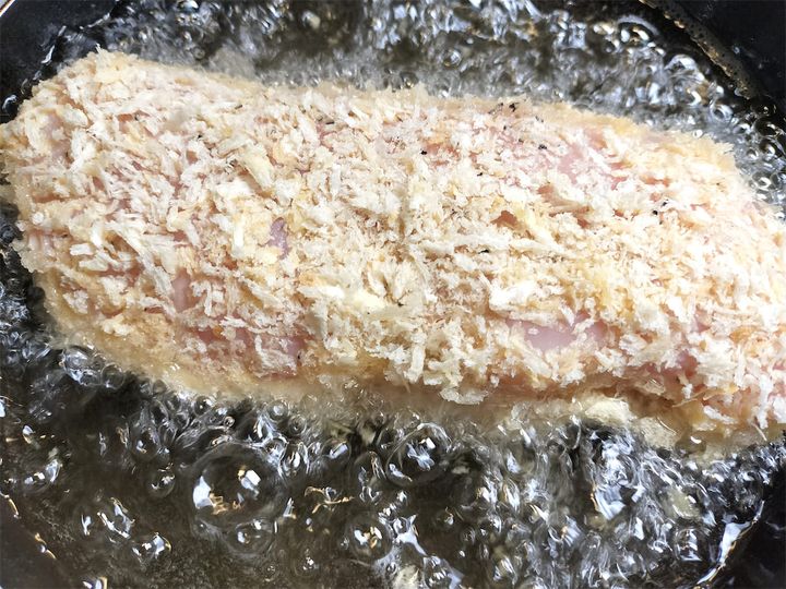 3. 小麦粉、バッター液、パン粉を順にまぶして油を約1cm入れたフライパンに入れ、弱火で約10分揚げ焼きにします。