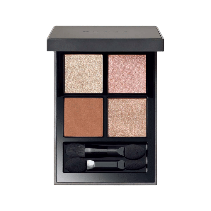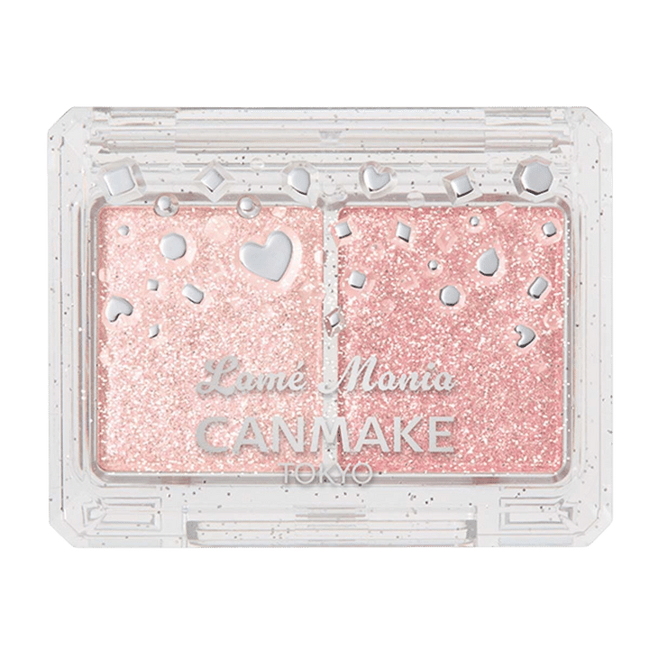 (上)大小さまざまなラメやパールが織りなすカラーヴェール、サテン、メタリック、マットの4質感。THREE スターゲージングアイシャドウクアッドX03 ¥7,480/THREE[限定品](下)多色の大小パールが混在し、濡れているようなうるうるとした輝きEYEに。ラメ飛びしにくい仕上がり。キャンメイク ラメマニア 02 ¥770/井田ラボラトリーズ[3月下旬発売]