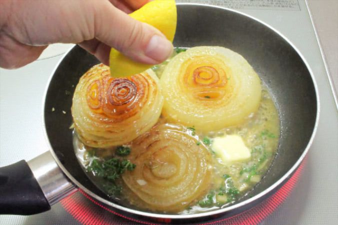 3. 【2つ星店の元シェフ発】チキンブイヨンとバターで煮詰めてレモンをギュッ!「新玉ねぎステーキ」作ろう!