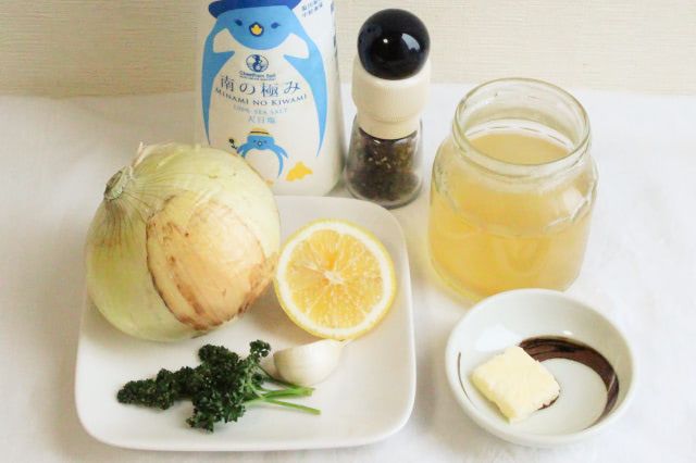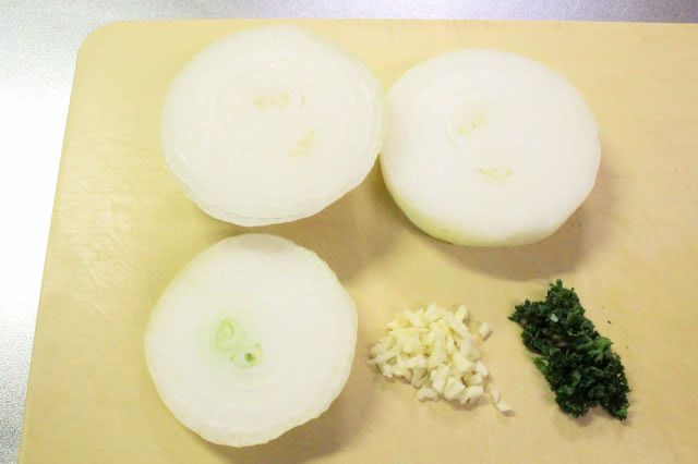 1. 皮を剥いた玉ねぎを、3等分に輪切りにします。にんにくとパセリは、みじん切りに。