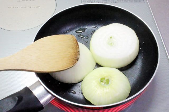 2. フライパンにオリーブオイルを引き、強めの中火で熱します。玉ねぎの断面を下にして並べ、少し押しながらこんがりと焼きます。