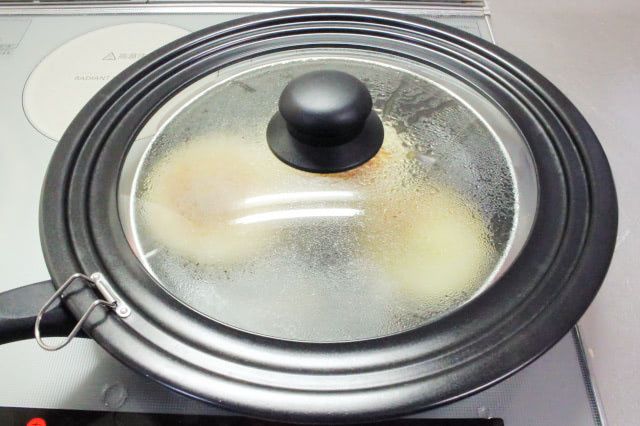 今回は水分が多い新玉ねぎを使ったので、チキンブイヨンを150mlに減らして加え、10分ほど蒸し煮に。蒸し煮にすることで、新玉ねぎの甘さを引き出せますよ。