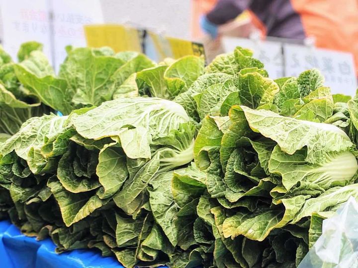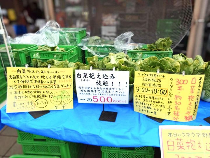 開催時間は9時~10時まで(なくなり次第終了)。この日は「白菜抱え込み放題」の回で、白菜300玉(約30名様分)が用意されていました。1分間で白菜を手元に集めて、そちらを一気に抱えて5秒間持ち続けられたらゲットできる、というルール。