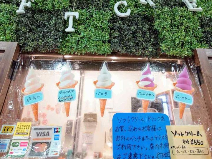 冬でも人気のテイクアウトソフトクリームもあります。「ピーナッツ・バニラ・ピーナッツとバニラのMIX・ブルーベリー・ブルーベリーとバニラのMIX」の5種(各税込550円)。屋外のテラスやベンチでゆっくりいただけます。