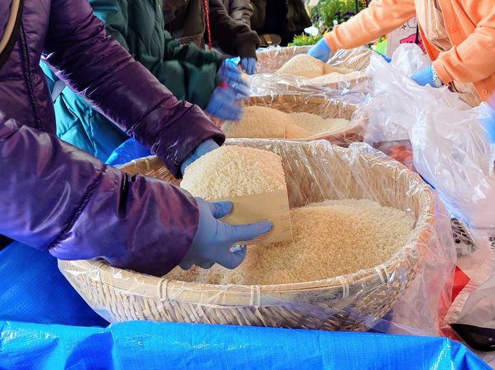 1分間でお米を枡に盛り、枡の淵を持ち上げてスタッフさんが用意する袋に入れてゲットできます。こぼさず山盛りにするとお米の量は1kg以上にもなるみたいです!