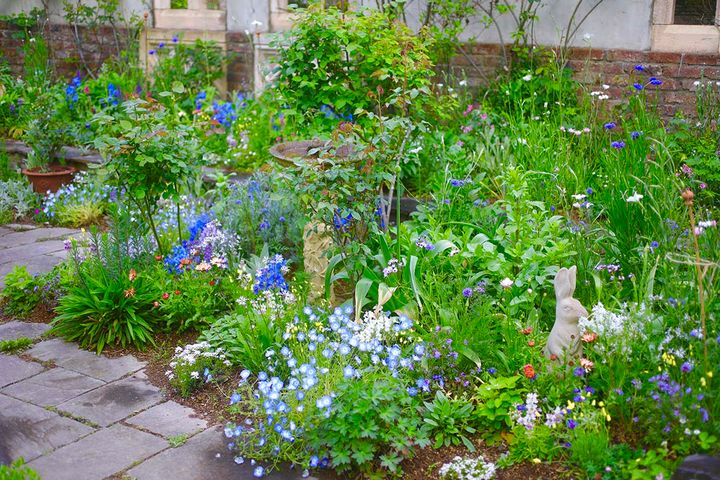チューリップが終わった後、草丈が30cmほどになったネモフィラが庭を幻想的に演出。