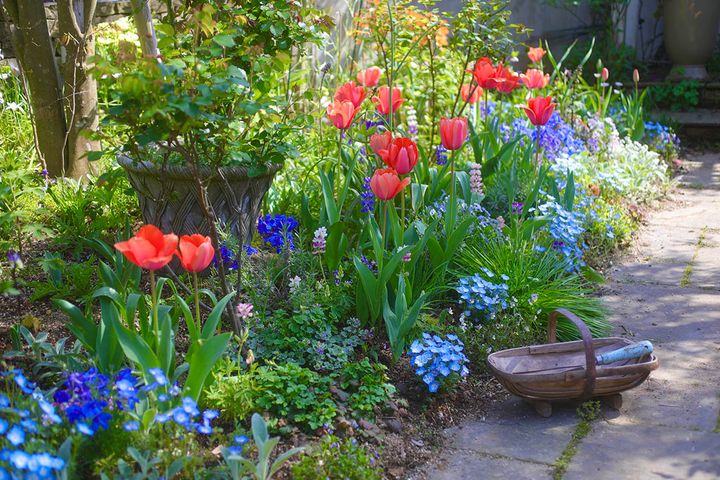 チューリップは前年の晩秋から冬にかけて植えたものが芽を出しているので、その間にネモフィラの苗を植え付けるようにします。あまり大胆に掘り返してチューリップの球根を傷めないように注意しましょう。ネモフィラの根は浅く広がるので、少し穴を掘って植え付け、上から盛り土をするような感じでもOKです。