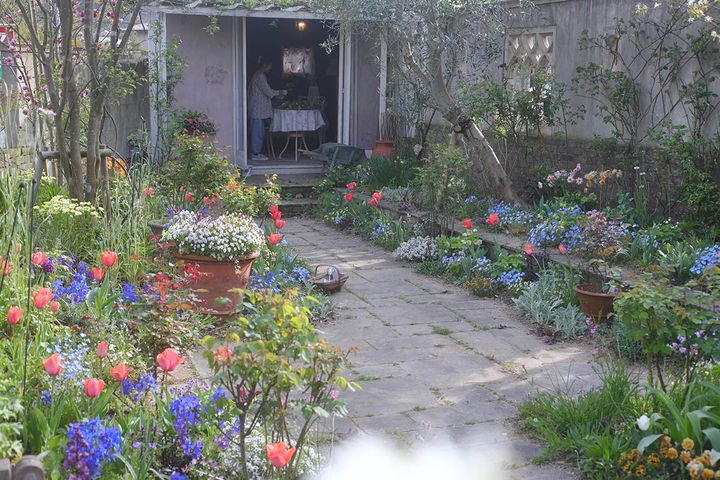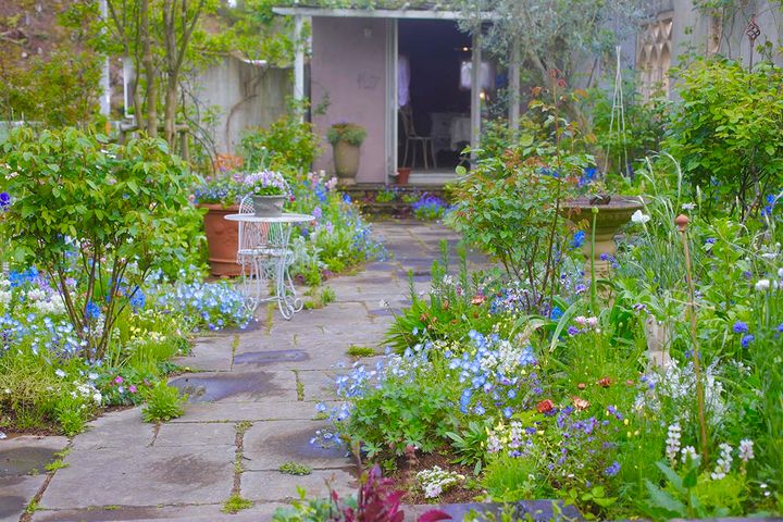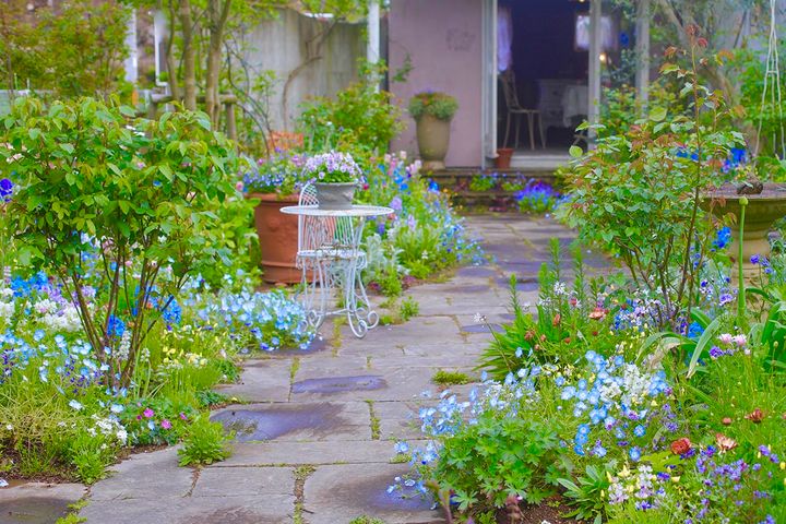 この庭では小道の両側や花壇の縁に沿って連続的にブルーがつながるように、手前から奥までネモフィラを植栽。連続させることによって、景色の中に「青の流れ」を作るようにします。