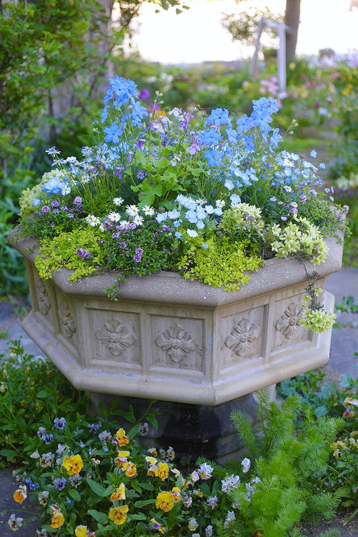 ネモフィラは横にやさしく広がる草姿をしており、寄せ植えの中で “ふんわり感”や“抜け感”を演出してくれます。ぎっしり詰まった寄せ植えに、軽やかさを加えられるまさに名脇役。さらに、印象的でありながら派手すぎない淡い青色は、 “つなぎの色”としても優秀で、他の花色を引き立てながら全体を調和させる効果があります。