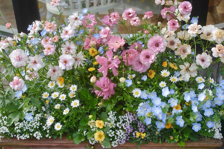 ネモフィラを中心に、ホワイト〜ブルー系の花でまとめると、シックで爽やかな寄せ植えが作れます。