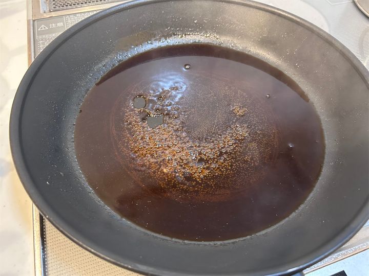 しょうゆ、みりん、砂糖を合わせて中火でフツフツとなるまで加熱。大体30秒くらいです。