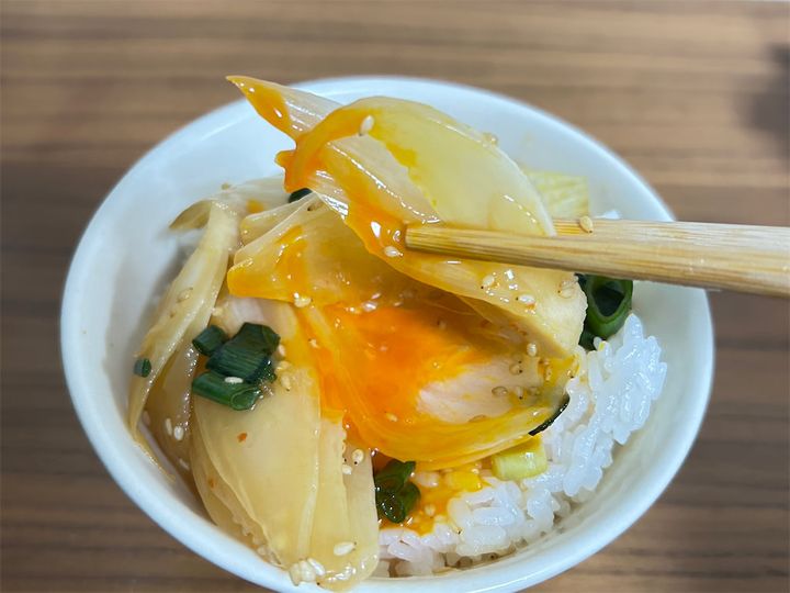 炊きたてのご飯に「漬け玉ねぎ」と卵黄を乗っけて…。