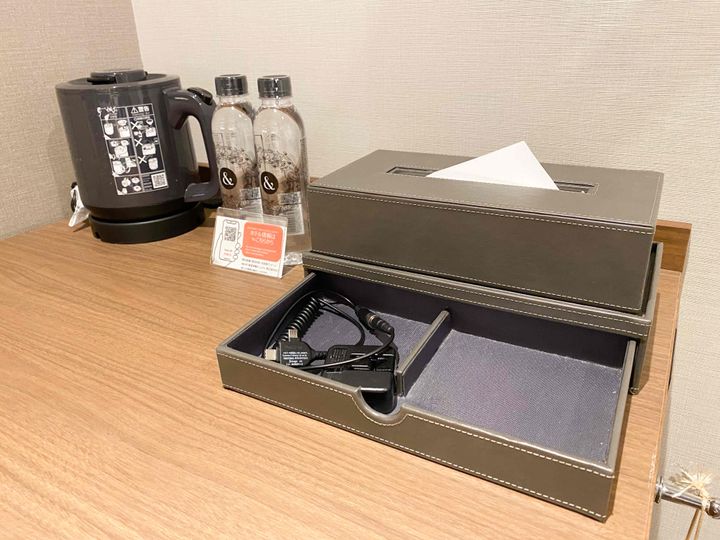 無料のペットボトルのお水やマルチタイプの充電コードなど必要なものが揃っていて、ホテルからの心遣いを感じます。